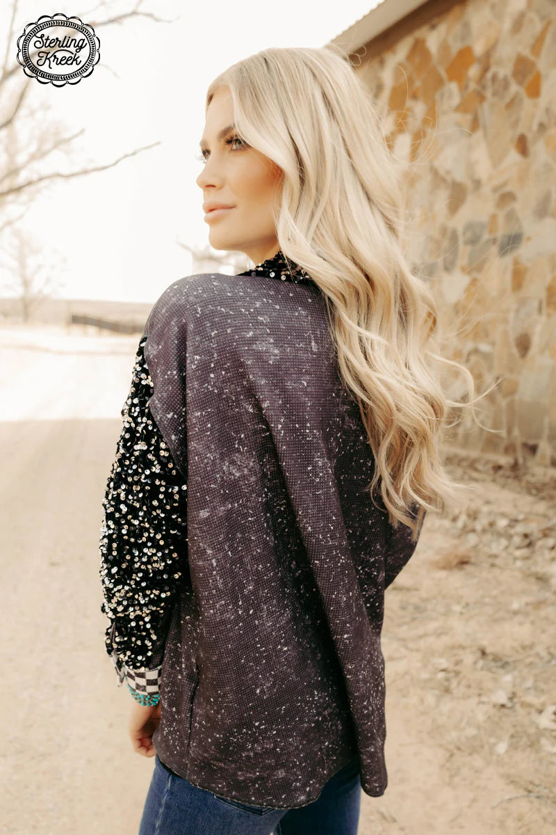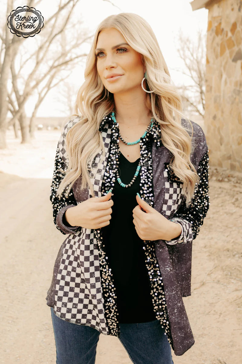 "Unleash your inner fashionista with our Bad and Boujee Shacket. This versatile piece features a bold black and white checkered side and a luxe mineral wash black side, dressed up with velvet sequin arms and collar. A must-have for any trendsetter!"oversized fit